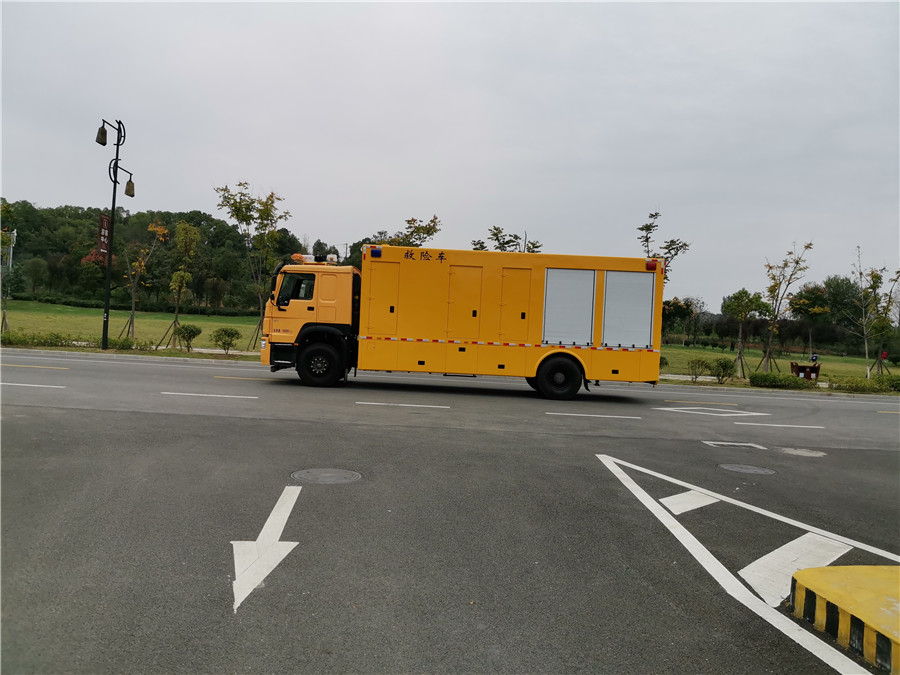 救险车厢体外部钢材为优质冷轧钢板,内衬优质冷轧钢板折弯骨架,配备多个高端铝合金卷帘门,强度牢固。厢体为全密封结构,具备运输、防雨、防腐、防火、防锈要求。车厢内顶分布多个照明灯,给夜间工作或维修作业时提供充分光线。发电机组进排风消声处理,消声器做降噪处理。工作门下裙围处设有隐藏式翻转梯,与车厢底板框架连接,方便拿取物品。