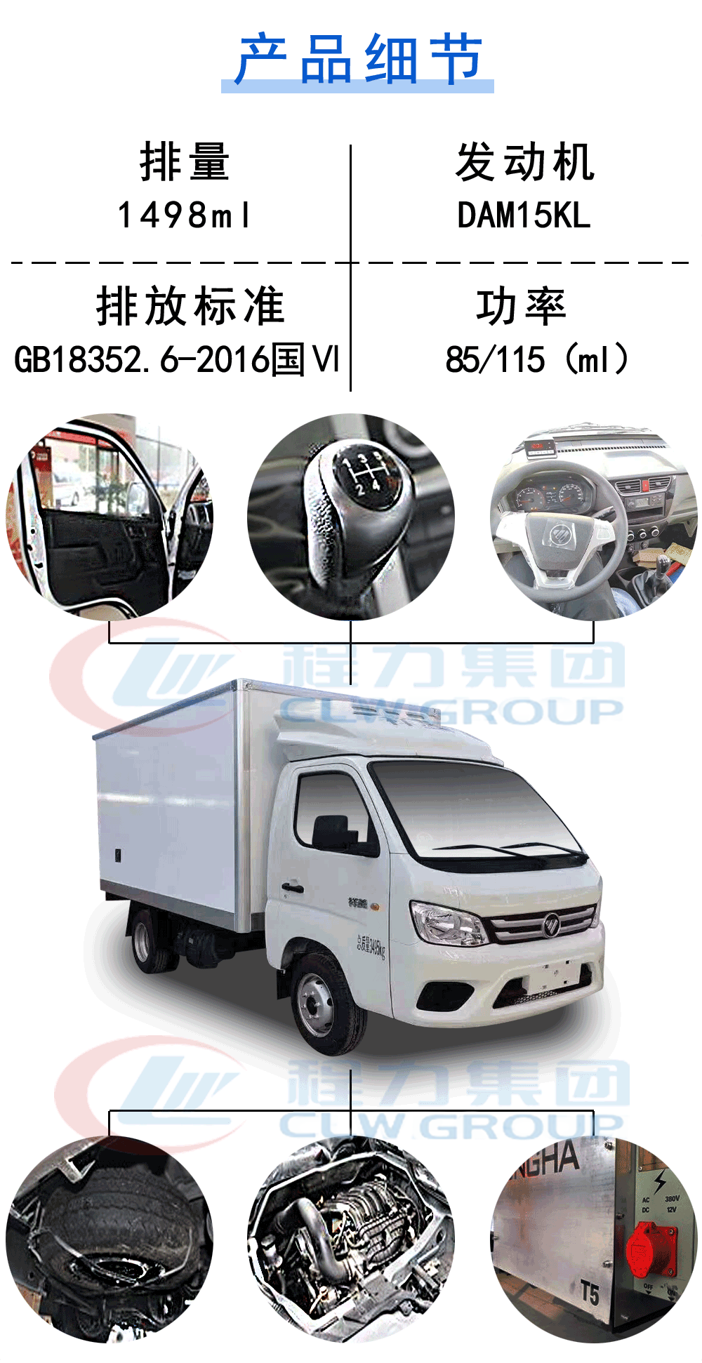 | 其他 | 货厢顶部封闭不可开启.ABS系统控制器型号为YF9,ABS系统控制器生产企业是武汉元丰汽车电控系统有限公司.可选装无侧开门风格货厢,可选装导流罩,可选装反光膜型反光标识.选装带前雾灯不带昼间行驶灯造型,选装带前雾灯及昼间行驶灯造型,可选装黑色装饰条,可选装不带黑色装饰条.发动机DAM15KL,DAM16KL对应的油耗值分别为8.3L/100km,8.7L/100km,分别对应最高车速100km/h,110km/h.选装同等功率不同造型的制冷机外观照片.选装高位进气管.选装后视镜风格. | ||
