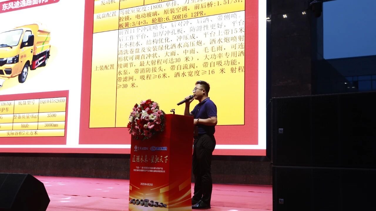 程力专用汽车股份有限公司总经理助理黄成,专题介绍了东风股份第九代新老款压缩垃圾车、洒水车的整车功能和先进的生产工艺、过硬的材质、标准化零部件,以及核心技术与坐月的品控管理及全时段相应的售后保障措施。